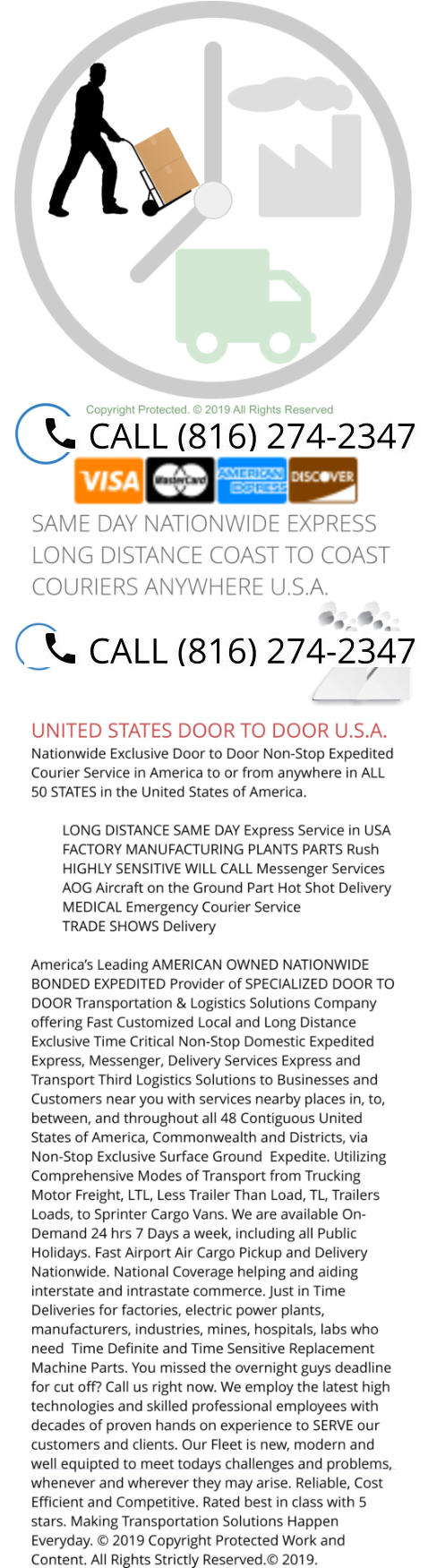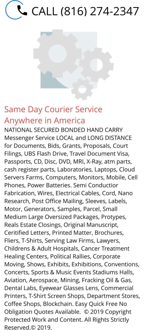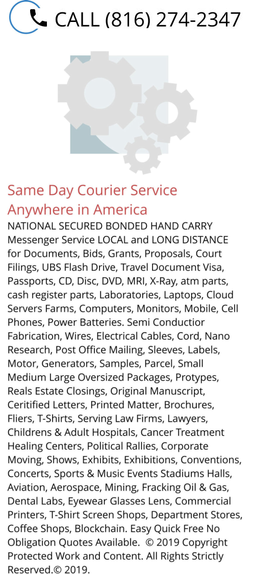 BONDED UNITED STATES TIME CRiTICAL SAME-DAY EXPRESS EXPEDITED PICKUP COURIERS & DELIVERY SERVICES to ANYWHERE / EVERYWHERE IN AMERICA USA. 1. Please take note of our NEW Business Phone Number (816) 274-2347 please update your records immediately, Thank You. The Only Recommended NATIONWIDE NATIONAL Local Same-Day Pickup United States Special Courier and Delivery Messenger Services near me in Every City of The United States, Place City of United States, in Every County of United States in North American Continent In Midwestern United States of America, All United States metropolitan areas, City and Metropolitan Center sand Suburbs United States, Midwest The United States, Every Major Cities in All States, Commonwealth and District in The United States of America where you are able to Speak with a Live Human Being Customer Support / Care Tracking Phone Contact 24/7/365. Contact Call Business Phone Number (816) 274-2347 America’s Customer Driven Top Rated Same-Day Express Expedited Local National and Regional Commercial Motor Carriers Lines with Full Scale Comprehensive Transportation Solutions with Varied Proprietary Courier and Delivery Domestic Options Nationwide. Yes We will Pickup and Deliver from Any and All and township in United States. Tri-State Delaware, New Jersey, Northern Liberties, Center City, Washington Square, West KOP King of Prussia, Manayunk, West Conshohocken, Blue Bell, Plymouth Meeting, Narbeth, Morrisville, Langhorne, Haverford, Quakertoqn, Newtown Square, Yardley, bensalen, Bristol, Warminster, Dresher, Doylestown, Coatesville, Denver Gap, lancaster, York, Reading Wyomissing, Collinswood, Ardmore Hvertow, Old City, Queen Village Fishtown Camden Trenton Cherry Hill South Jersey swedesboro Gloucester City Somerset Rittenhouse Square University City East Passyunk Fairmont Logan Square Bella Vista South Philly Northeast Philly West philly Baltimore MD, Yorktown New Philadelphia Callowhill Chinatown New Kensington Packer Park Port Richmond 2. USE the Top Trusted Highly Recommended Transformative Solutions Company with Proven Competitive Cost Savings Same-Day United States, America Time Critical Pickup and Delivery Couriers Messenger to or From ALL Business Address Anywhere or Places in ALL of the United States of America. Known by Customers and Clients alike as America’s Great Company to Use and Hire for Must- Ride Non-Stop Expedited Same-Day Time Critical Transportation Express Logistics Anytime Anywhere and Everywhere in The United States. 3. Try the Best Proven Bonded United States Express Logistics On-Demand Time Sensitive Domestic Non-Stop National Nationwide Exclusive Long Distance Expedited Express. 4. We Offer Specialized Regional & National Bonded United States Time Definite IntraState and InterState Courier Delivery Services in Near Everywhere in The United States Regions Areas City Places Townships Villages Towns Hamlets Boroughs Counties United States. 5. Verified Locally Based Since 1961 Bonded United States Courier Company and Business Near Northeast, New England, Midwest, The South, Central, Mid Atlantic United States Regions Areas. 6. The Nationwide Long Distance Leader Providing Bonded United States Freight Forwarding in Near Everywhere United States New England, Northeast, North East, Mid Atlantic, The South, Dixie, Midwest, United States Regions Areas. 7. Providing High-Value Bonded United States Delivery Services in Near Midwest, Mid Atlantic, New England, Northeast, North East, The South, The Southeastern, Western Central United States Regions Areas. 8. Providing the Best Bonded United States Messenger Services in The Entire United States Regions Areas. 9. We are the Leading Bonded United States Trucking Company LTL and TL in Near Any and ALL of The United States Regions Areas. We are North America’s Leading Time Critical Courier Delivery and Transportion Solutions Specialist and Experts. Intermodal backup available On-Call. 10. We are the Top Premier Premium Exclusive Same-Day PBonded United States Shipping Company in ALL Cities Boroughs Townships in United States Regions Areas. We are the First Choice Serving Businesses, Companies, Contractors, and Industrial Customers and Clients in ALL Locations across the Continent. 11. Offering Highly Secured Highly Sensitive Valuable Bonded United States Shipping and Mailing Services in Near Everywhere and Anywhere in The United States Regions Areas. 12. We are the Only AOG Bonded United States Courier, Messenger and Delivery Services in Near Every Location in the United States Regions Areas. 13. Offering Local, Long Distance National and Regional Bonded United States LTL and TL Freight Services in Near ALL United States Regions Areas, via Nationwide Locations and Terminals. 14. Offering Highly Sensitive Bonded United States Couriers & Delivery Services to in every town city municipality borough village Enterprise Industrial Park Commercial District Complex Factories Plants Campus Colleges Universities Schools Tax Free Zones Ports Airport Seaports Hospitals Medical Centers Data Centers Green Coal Oil Nuclear Natural Gas Solar Wind Bio Fuel Oil Petroleum Hydro Electric Power Plants that is near or closest to you in America. 15. You are asking “ Which Courier and Delivery Services Near me in the ENTIRE United States of America is Open Now 24 Hours and Everyday including Public State and Federal Holidays? Answer that is us, Happy to say. 16. Delivering Bonded Same-Day Time Critical, Time Sensitive and Time Definite Highly Sensitive Hand Carry Bids, Will Call Pickup & Delivery Messenger Services, Grants, Proposals, LATE or MISROUTED PAYROLL RESCUES, Letters, Printed Matter, Documents, Machine Parts, Manufacturing Parts, Circuit Breakers, HVAC, Replacement Parts, Rescues for Misrouted Missorted Delayed Stranded Freight Shipments, Wills, Bonds, Stocks, U.S. Treasuries, will call concerts shows music tickets, Sleeves, Labels, T-Shirts, Promotional Materials, Electrical Supply, Industrial Equipment Supplies, Pa